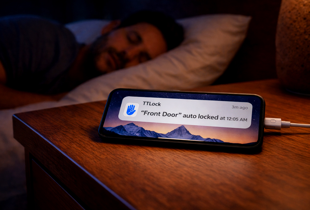 Auto-lock kicks in at 10pm. Check the app from bed. Everything secured. No need to get up.